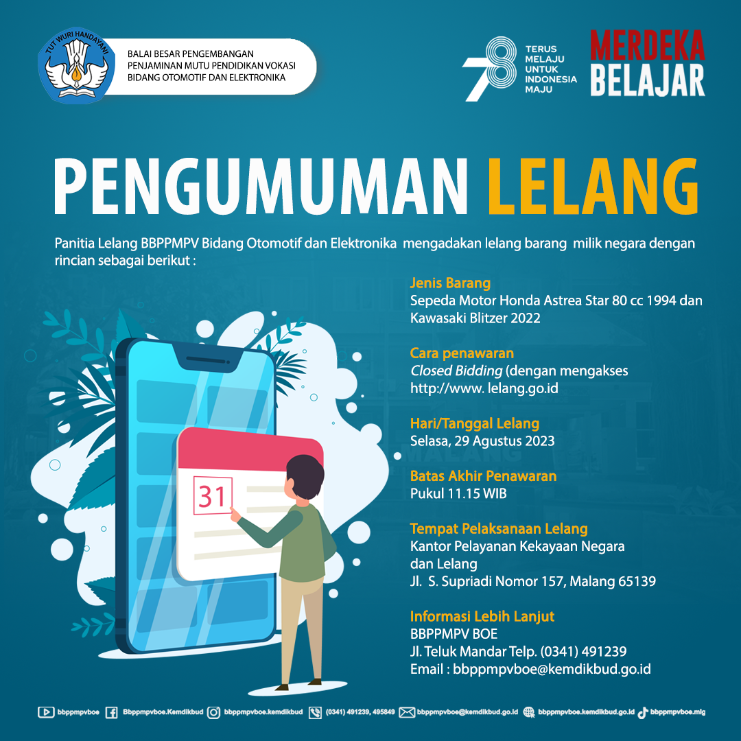 Panitia Lelang BBPPMPV Bidang Otomotif dan Elektronika mengadakan lelang barang milik negara dengan rincian sebagai berikut :